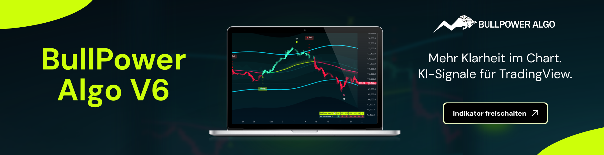 Aktiviere jetzt deinen KI-gestützten TradingView-Indikator BullPower Algo V6 für klare Charts und fundierte Entscheidungen.